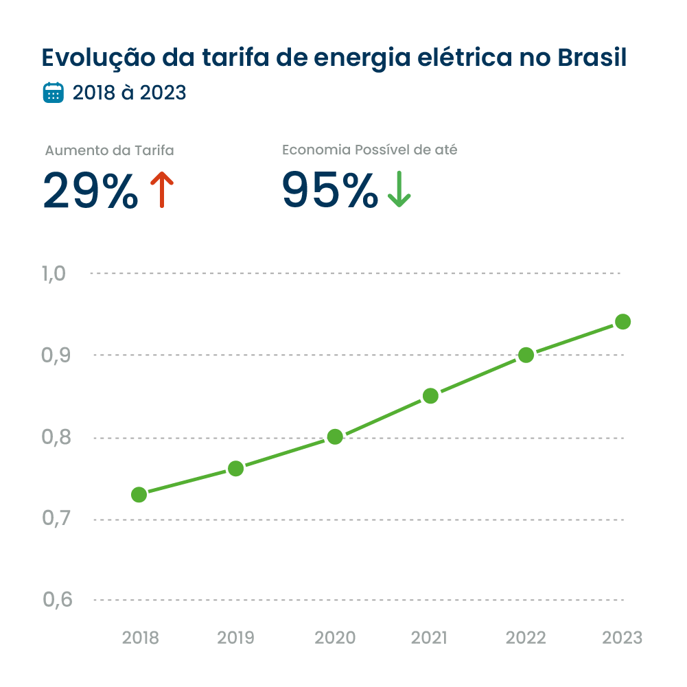 Nos últimos anos, o custo da energia elétrica no Brasil só aumentou — e a tendência é continuar subindo. Observe no gráfico: entre 2018 e 2023, a tarifa média subiu cerca de 29%. Quem investe em energia solar garante proteção contra novos reajustes e transforma um gasto em economia.
